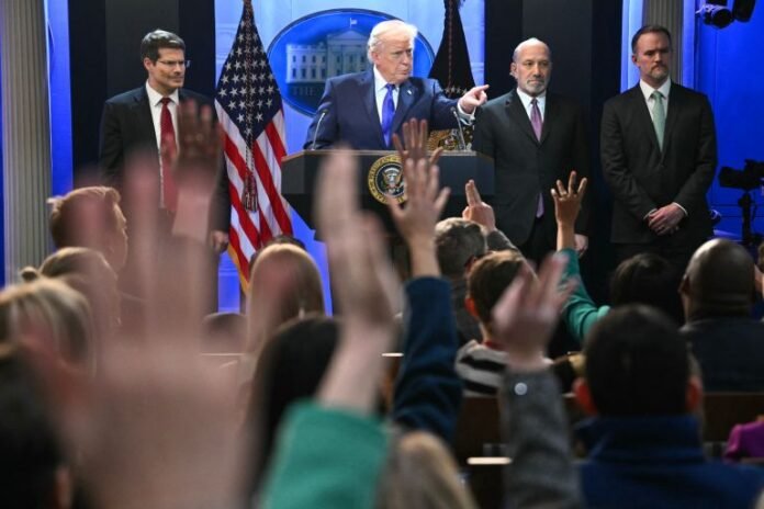 US President Donald Trump takes questions from reporters during a news conference at the White House in Washington, DC, on February 20, 2026 [Mandel Ngan/AFP]